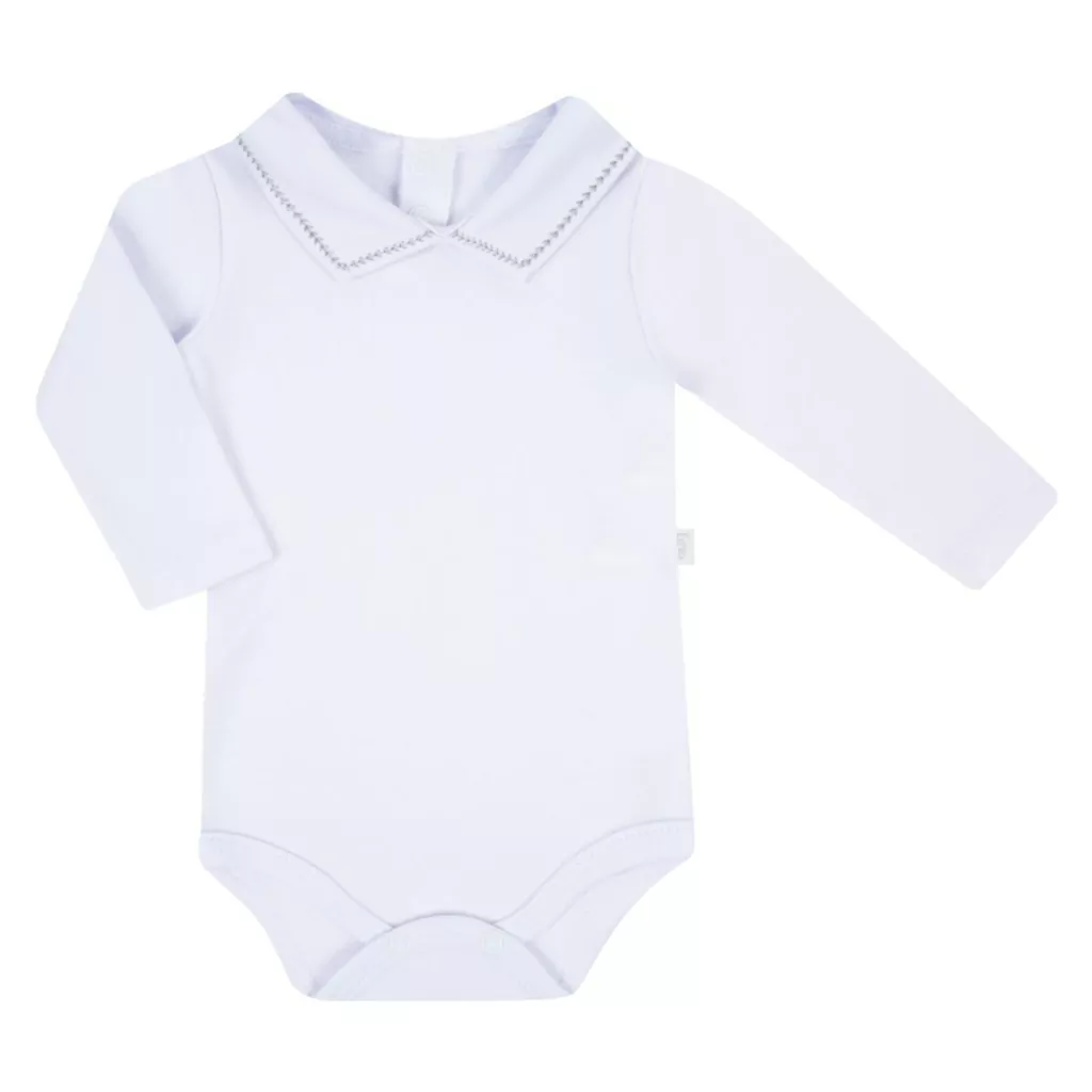 Body Bebê Branco Liso Longo com Gola Bordada em Cinza - Hug. Confira abaixo todos os detalhes: