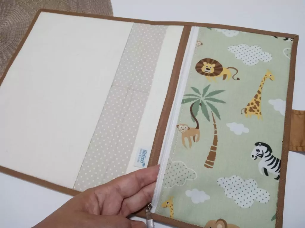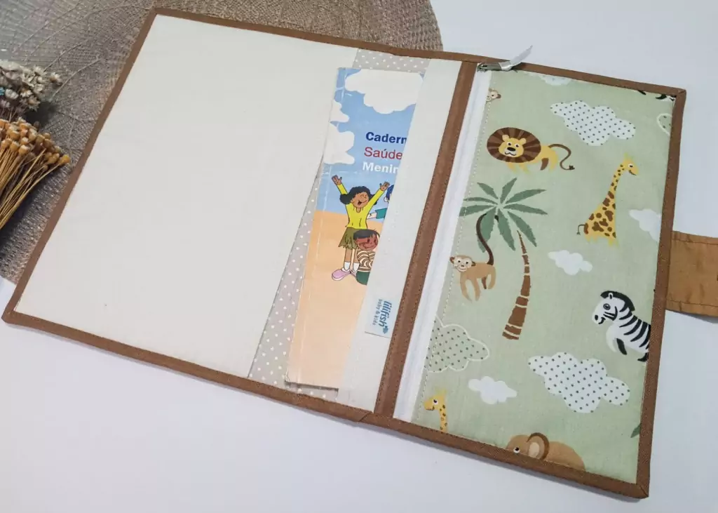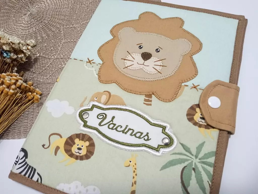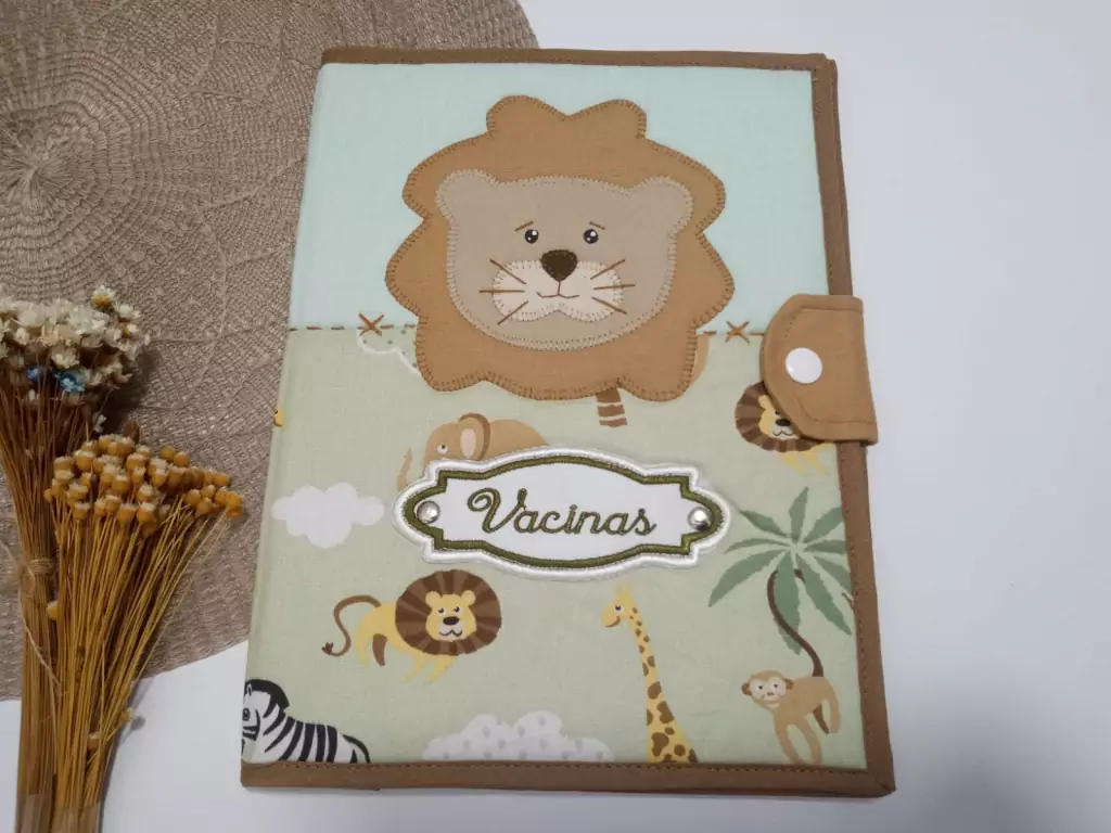 Linda capa de caderneta de vacinação, com 3 bolsos internos, sendo 1 com zíper, para armazenar documentos e a caderneta vacinas, e fechamento com botão de pressão. Possui bordado "Vacinas" e aplicação de leão em ponto caseado.