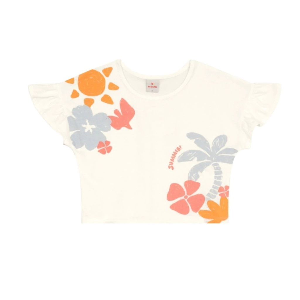 Deixe sua pequena ainda mais charmosa com o conjunto infantil da Brandili. A blusa cropped em meia malha apresenta uma estampa colorida de flores, gola redonda e mangas curtas em babado, trazendo leveza e feminilidade. O shorts em moletinho tem cós elástico e aplique decorativo termocolante, garantindo conforto e estilo. Ideal para dias quentes, esse look moderno é perfeito para brincar e se divertir com muito charme.