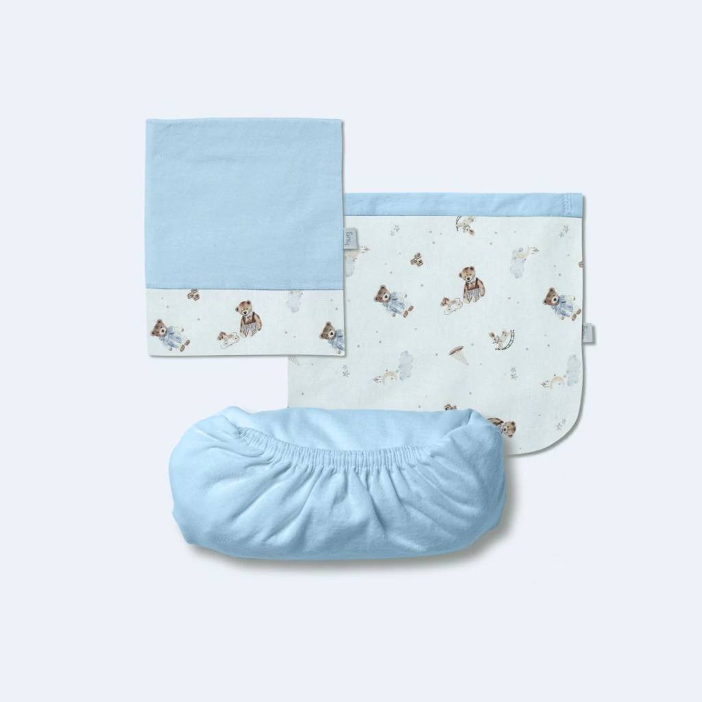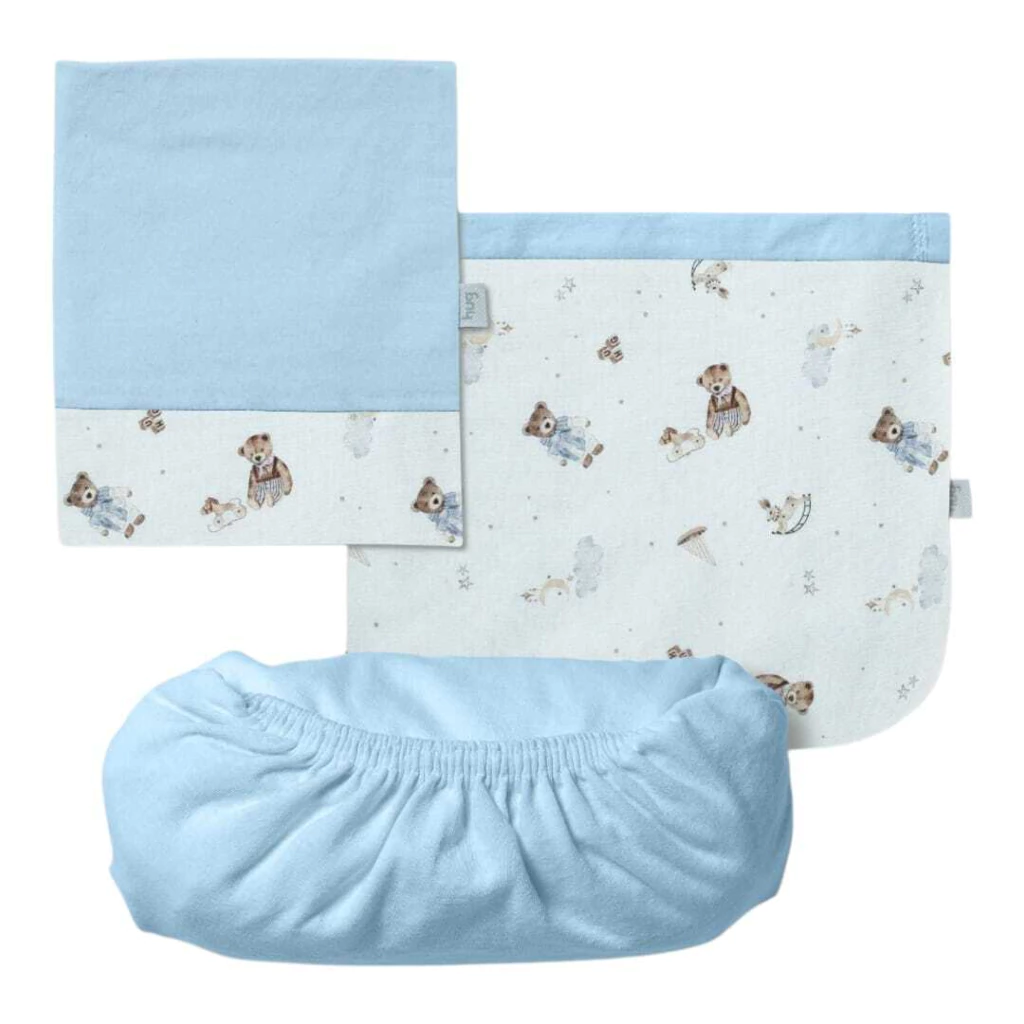 O Jogo de Lençol 3 Peças Hug traz conforto e cuidado para o quartinho do bebê. O kit possui um lençol de elástico, uma fronha e sobre lençol com vira em suedine estampado. Além disso,o sobre lençol é ótimo para cobrir o bebê. Indicado para berço padrão americano.