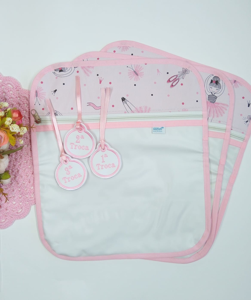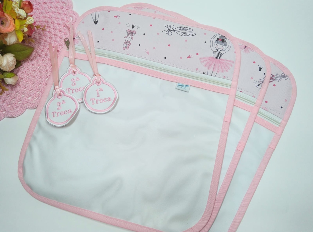 Kit composto por 3 saquinhos com zíper e 3 tags bordadas (1ª Troca, 2ª Troca e 3ª troca ).