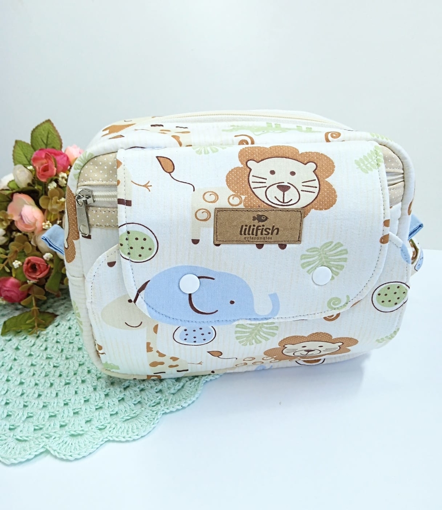 Nécessaire de Higiene do Bebê Luxo Safári produzida em tecido 100% algodão na parte interna e externa, com alça de mão, possui bolso externo para lenço umedecido e aba com bolso em plástico cristal. Na parte maior, possui espaço para fraldas, talco, etc.